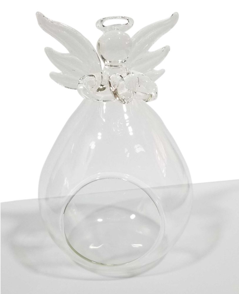 Angel de la guarda fabricado en vidrio con centro hueco para colocar dentro velas, flores santos miniatura, tarjetitas o fotos. Tamano: 12 X 8 X 7 cm Material: vidrio cristal