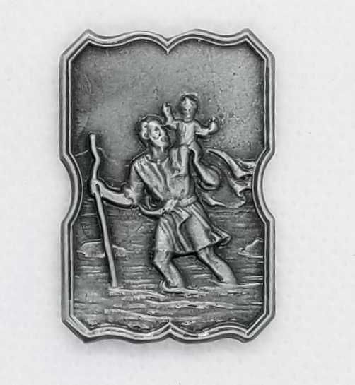 Detente metálico en color plata / con imagen de San Cristóbal en relieve / con doble contacto en la parte trasera / Dimensiones: 3 x 2 cms.