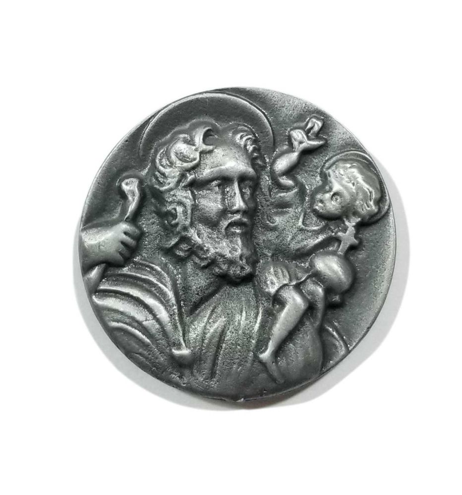 Detente metálico en color plata / con imagen de San Cristóbal en relieve / con doble contacto en la parte trasera / Diámetro 3,5 cms.
