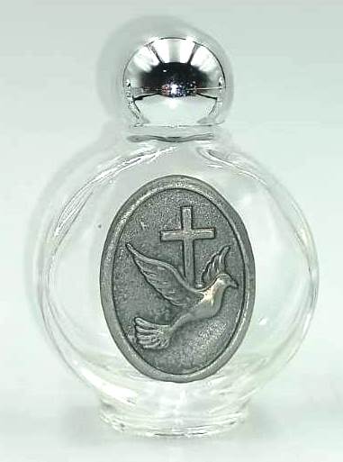 Botella de vidrio con tapa, para agua bendita / Dimensiones: alto 6 cms. – ancho 4,5 cms. / Imagen metálica color plata / Nota: Botellas no incluyen agua.