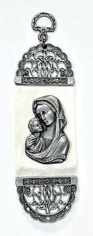 Colgante metálico con imagen de la Virgen con Niño. Disponible en 3 colores Medidas: 22cms de largo total. Debe indicar el color.