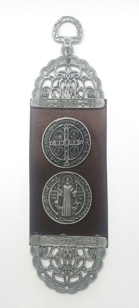 Colgante metálico sobre cinta de raso con medalla de San Benito ambas caras / medidas: 16cm de largo aprox.