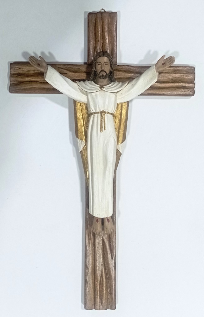 Cristo Resucitado / Material: madera y piedra reconstituida / Dimensiones: Cruz 30×19 cms. – Cristo 18 x 14,5 cms.