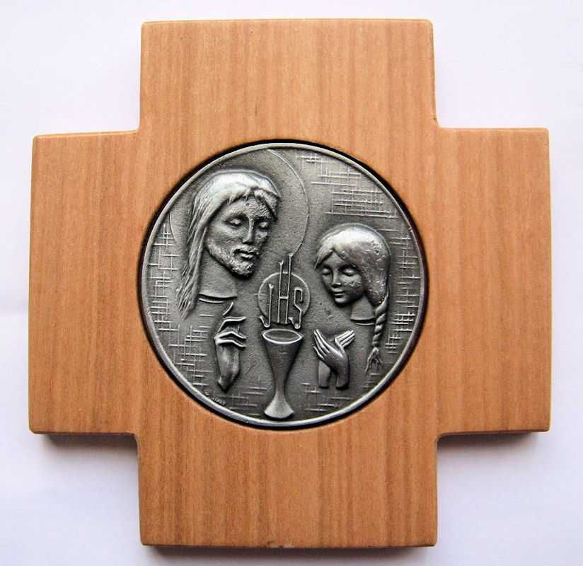 Medidas: 12 x 12 cms. Material: Madera con medalla metalica