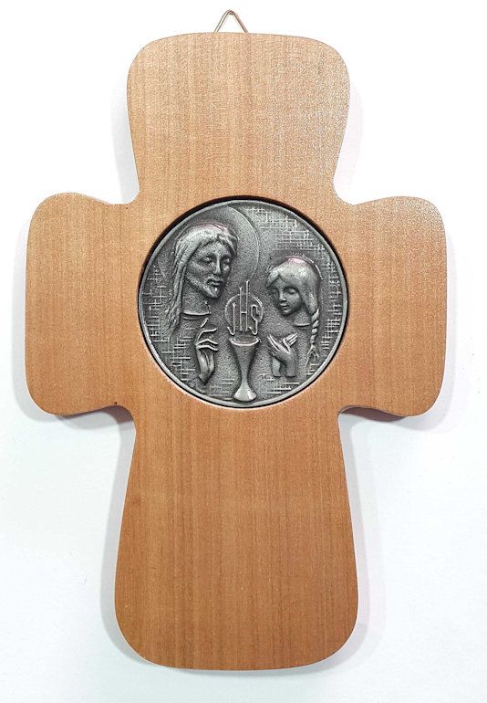 Cruz de madera con medalla de metal color plata opaca con motivo de primera comunion (nina) medidas: 18x12cm