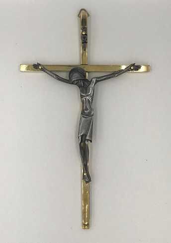 Medidas: 11 x 19 cms; Cristo: 10 cms Cristo Terminacion Plata Vieja Material: barras de bronce macizo y detalles en metal de aleación