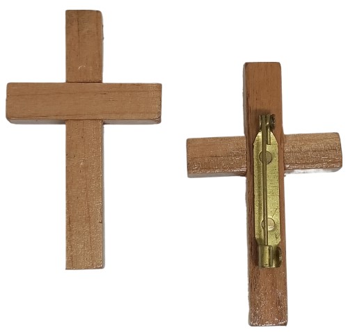 Cruz de madera, coigue natural, laqueda con gancho / dimensiones: 6 x 4 cms. / gancho metálico color dorado en la parte trasera de la cruz