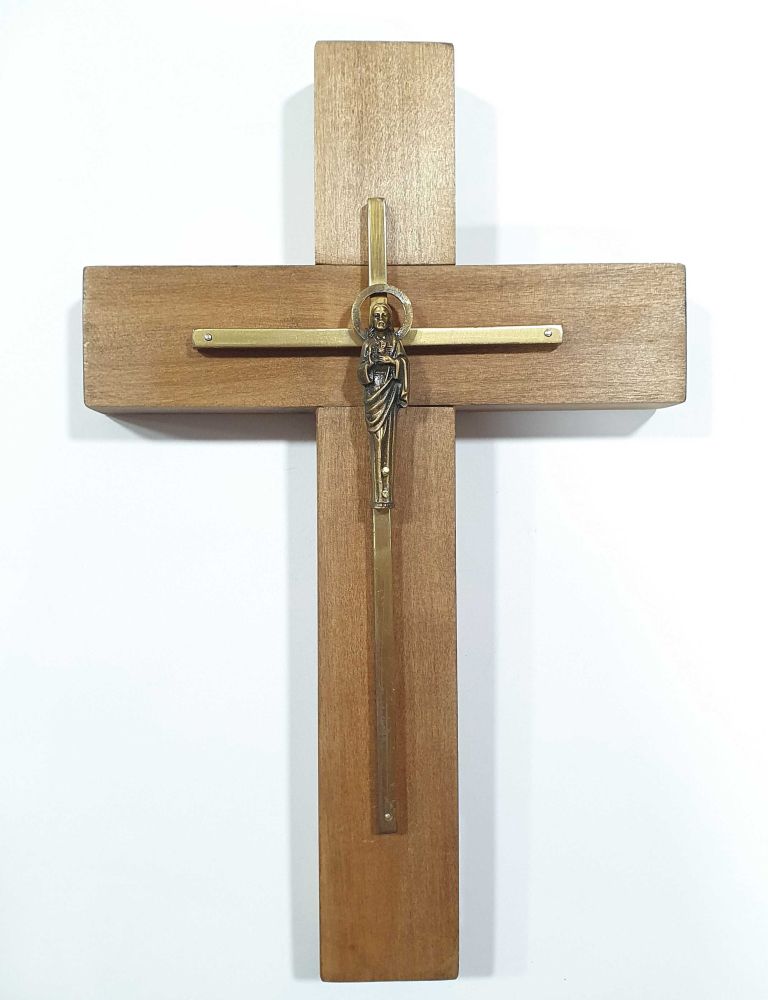Cruz de madera con cruz de bronce y detalle de Sagrado corazon de Jesus en metal medida de la cruz: 24x15x2 cm medida cruz de bronce: 16×9 cm