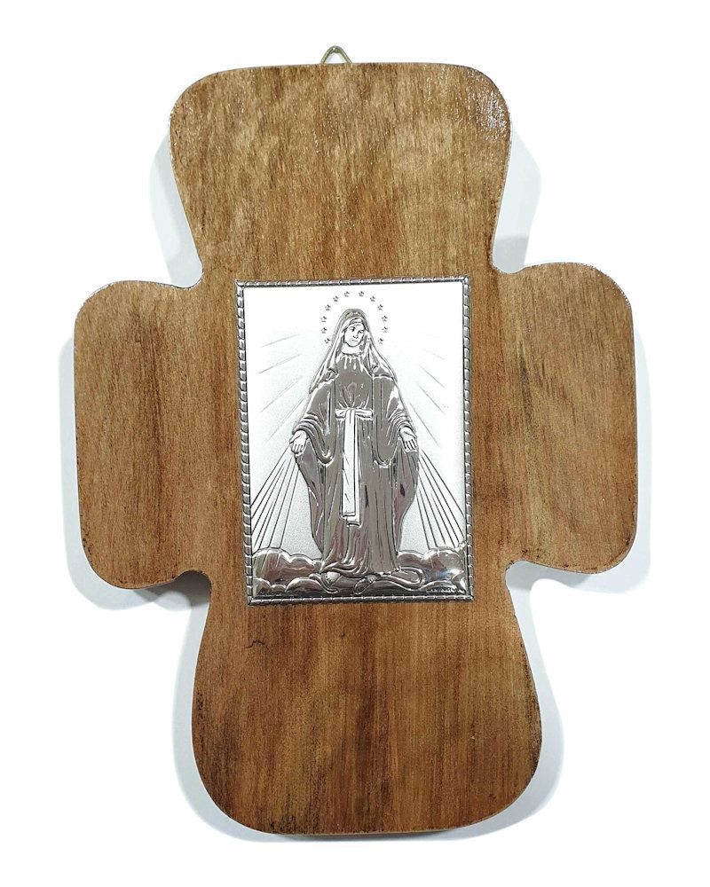 Cruz de madera con imagen en plata italiana de la Virgen de los Rayos medidas: 17x12cm