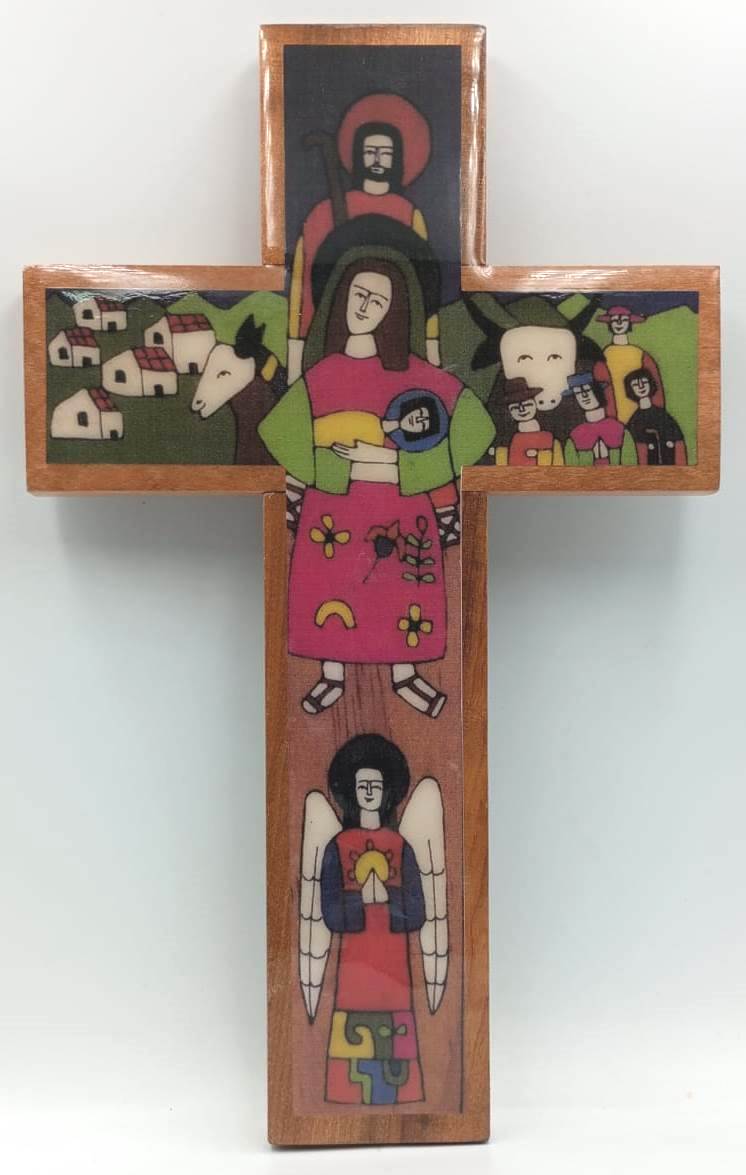 Cruz de madera natural para colgar / Imágenes de Angel de la Guarda, María, Jesús y más, recubierta en resina (efecto vidrio) / Dimensiones: 25 x 15,5 x 1 cms.