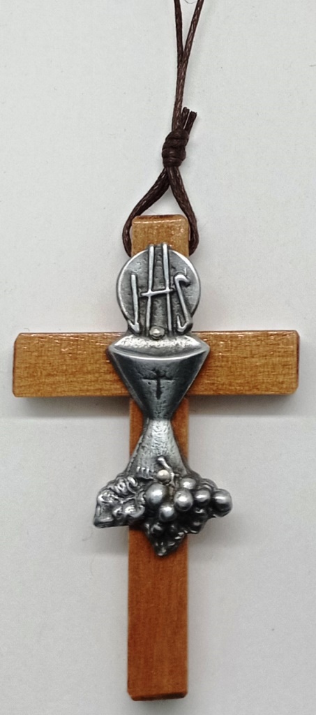 Cruz madera 6 x 4 cms. con copón alargado terminación en color plata