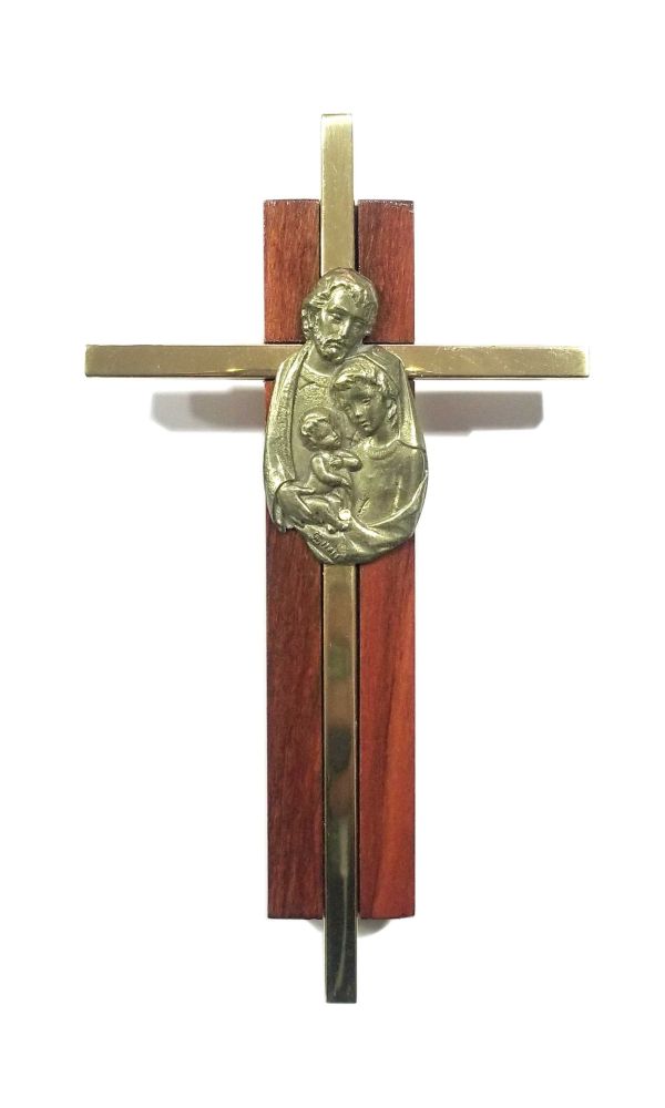 Cruz colgante con diseno americano, motivo la sagrada familia Tamano: 16X9cm materiales: barras de bronce y madera natural