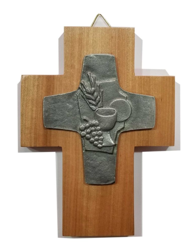 Cruz con motivo de primera comunion elaborada en madera con imagen metalica Tamano: 15 X 11 cm