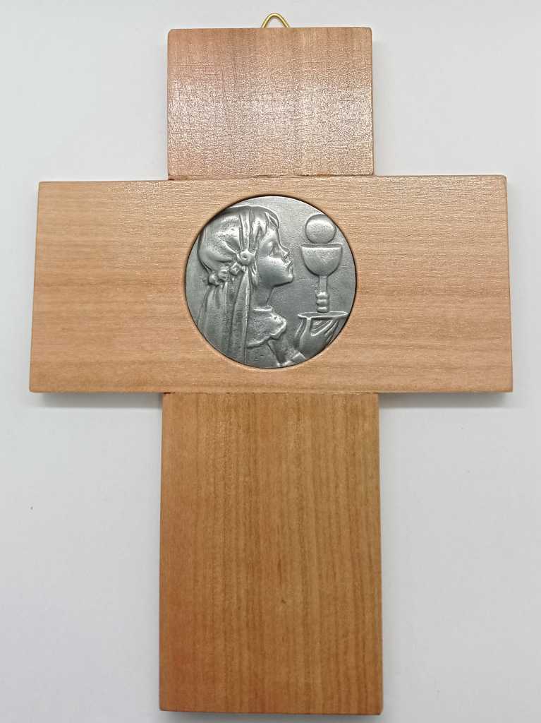 Cruz de madera con figura metalica. Ideal para primeras comuniones. tamano 11 x 15 cm.