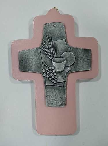 Cruz rosada de madera – Primera Comunión / Dimensiones Cruz madera: 14 cms. x 9,5 cms. / Dimensiones cruz metàlica: 9 cms. x 7,5 cms.