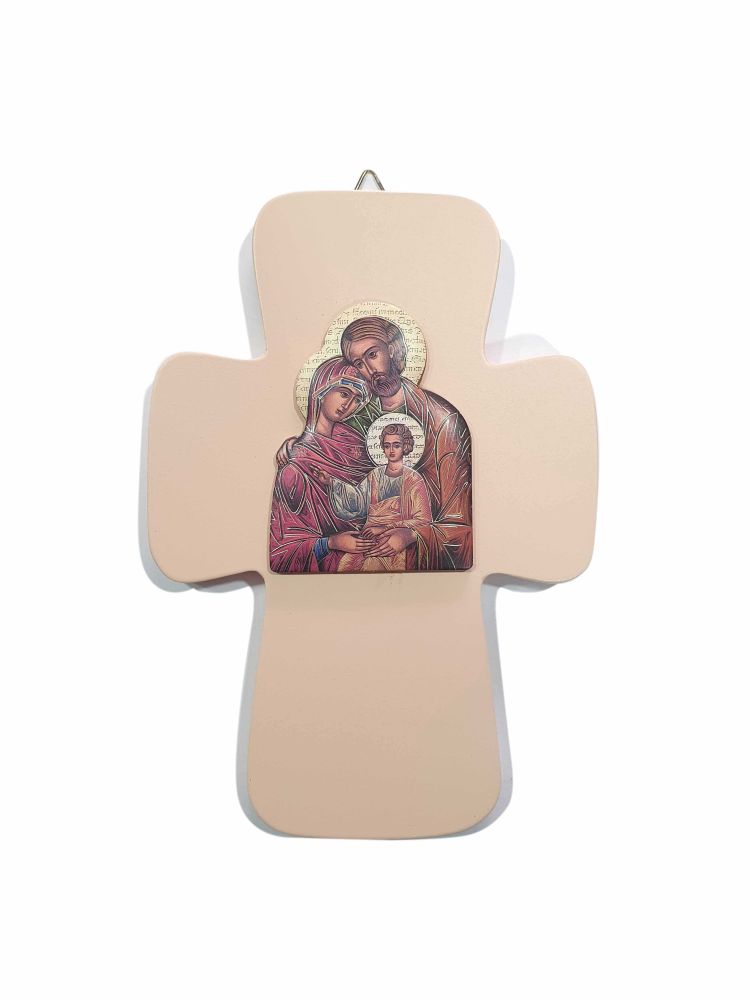 Cruz de madera color rosa claro con imagen en relieve de la sagrada familia medidas: 18x12cm