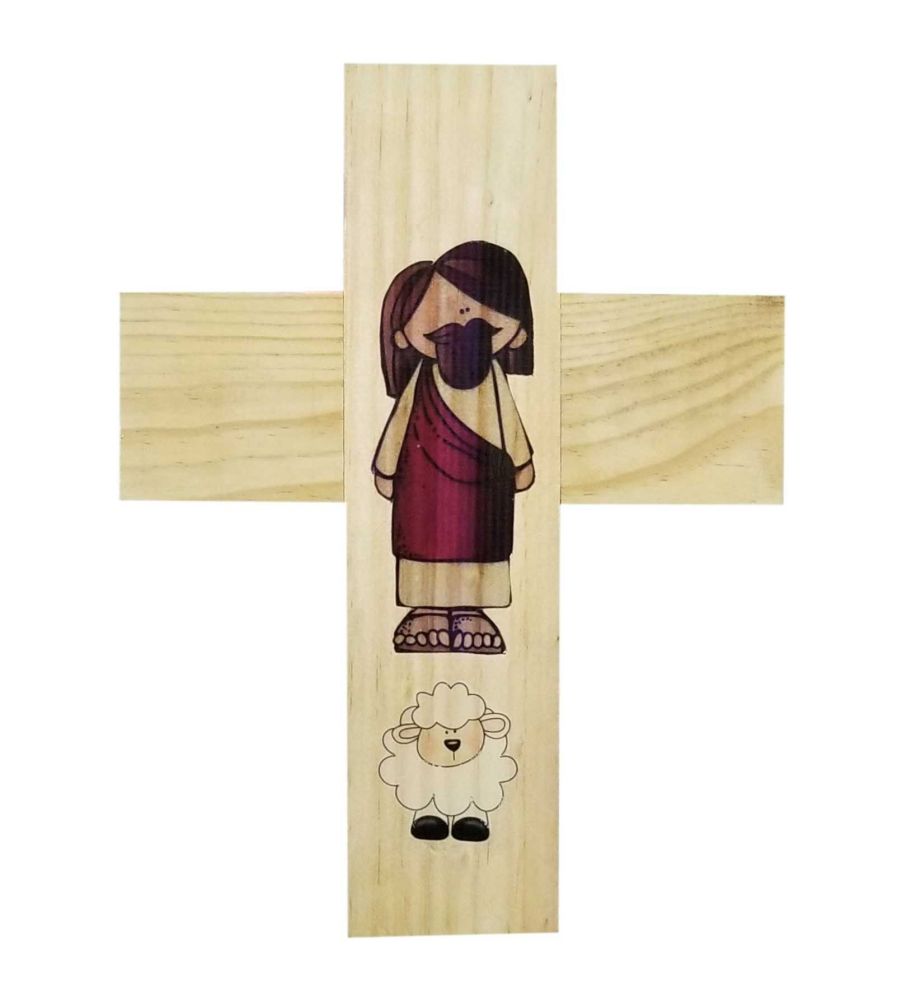 Cruz de madera natural laqueada, con imagen San José pastor línea juvenil / imagen resinada (efecto vidrio) / Dimensiones : 25 x 19 x 1 cms.