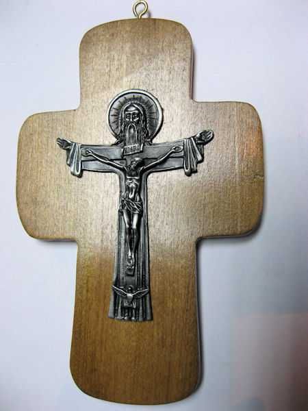 Cruz de madera hecha a mano con figura metálica. Cruz disponible en 2 colores. Tamaño: 18 x 12 cms Debe indicar el color de la cruz.