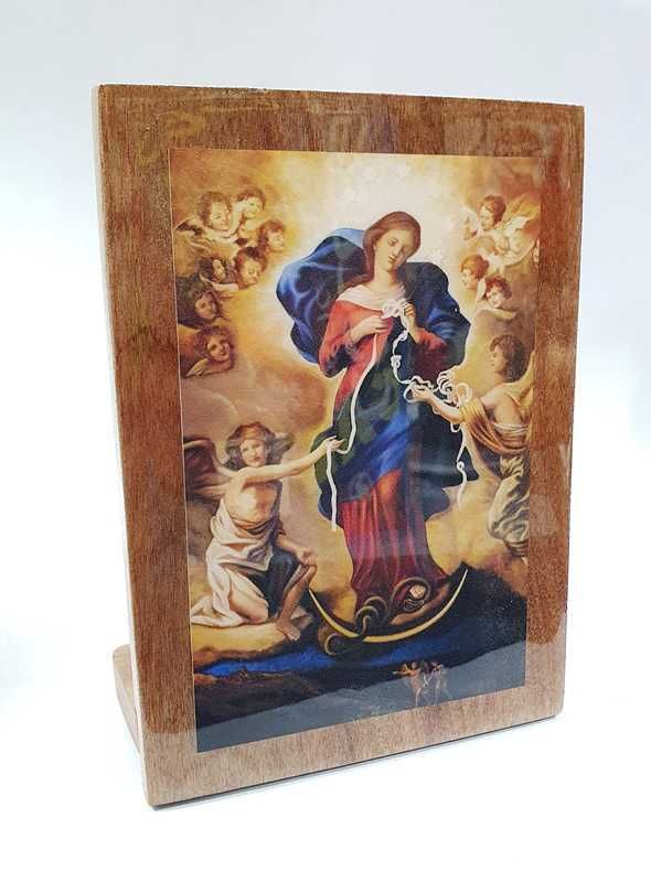 Cuadrito repisero con imagen de la Virgen desatanudo medidas: 13 x 9,5cm elaborado en madera de alerce con imagen recubierta por resina efecto vidrio cristal.