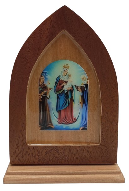 Cuadro repisero en madera natural, con imagen resinada Virgen DE Chinquinquira / Dimensiones respaldo: 12,5 x 9 x 1 cms. – Dimensiones base: 10 x 4, 5 x 1 cms. – Altura total 13,5 cms.