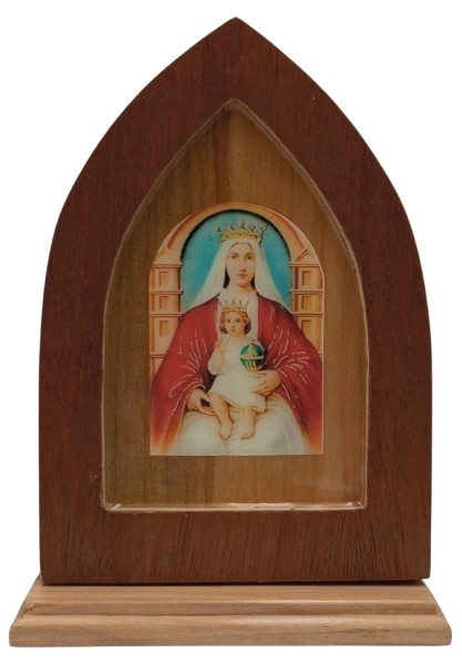 Cuadro repisero en madera natural, con imagen resinada Virgen Coromoto / Dimensiones respaldo: 12,5 x 9 x 1 cms – Dimensiones base: 10 x 4, 5 x 1 cms. – Altura total 13,5 cms.