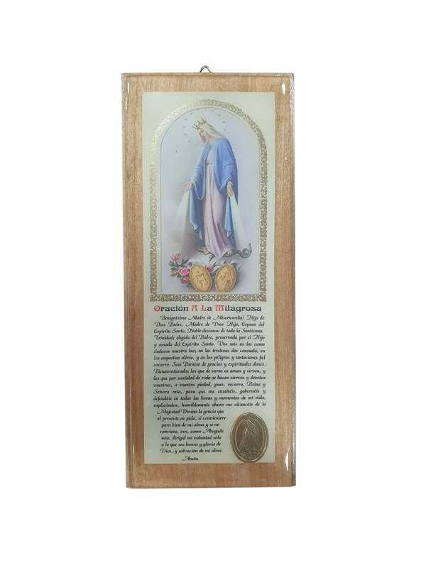 Cuadro para colgar con imagen de la Virgen de los rayos y su medalla milagrosa, con escrito del rezo a la Virgen. medida: 19 x 8cm