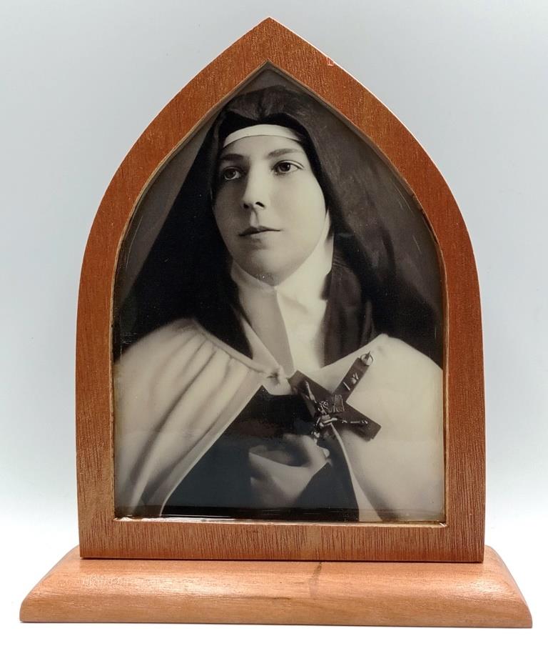 Cuadro repisero en madera natural, con imagen resinada Santa Teresa de los Andes / Dimensiones respaldo: 16 x 12 x 1 cms – Dimensiones base: 14 x 5 x 1 cms. – Altura total 17 cms.