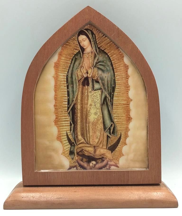 Cuadro repisero en madera natural, con imagen resinada Virgen Guadalupe (destellos dorados) / Dimensiones respaldo: 16 x 12 x 1 cms – Dimensiones base: 14 x 5 x 1 cms. – Altura total 17 cms.