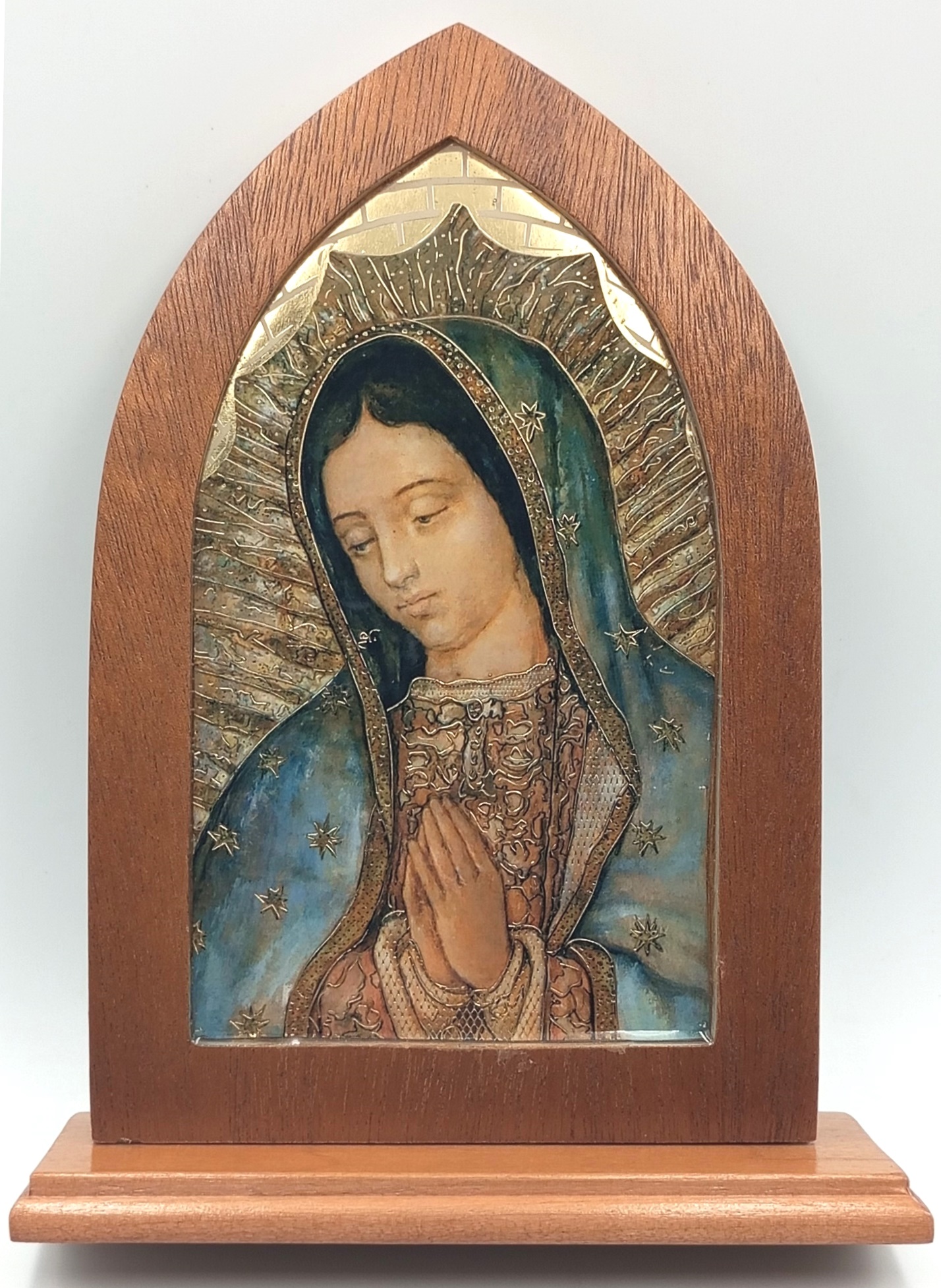 Cuadro repisero en madera natural, con imagen del rostro Virgen Guadalupe y aplicaciones doradas – imagen resinada / Dimensiones respaldo: 18 x 12 x 1,5 cms. – Dimensiones base: 14 x 5 x 1 cms. – Altura total 19 cms.