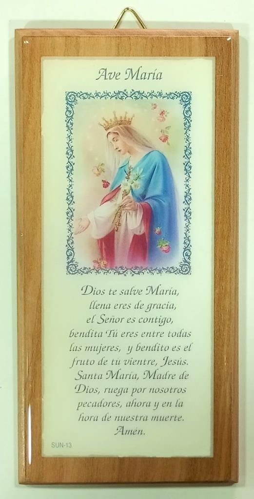 Cuadro con imagen y rezo Ave María, para colgar / Elaborado en madera color natural barnizada – imagen resinada efecto vidrio / Dimensiones: 16 x 8 cms.