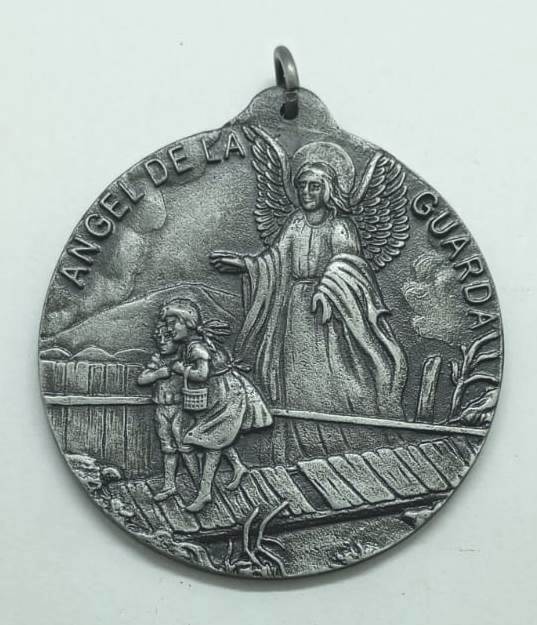 Cunero metálico con argolla, diseño niños y ángel de la guarda sobre puente / metal de aleación en color plata / Diámetro 5,5 cms.