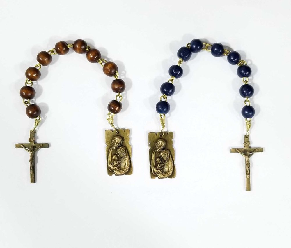 Denario abierto con medalla cuadrada de la Sagrada familia en bronce bolitas de madera y detalles de metal colores disponibles: azul y cafe valor unitario