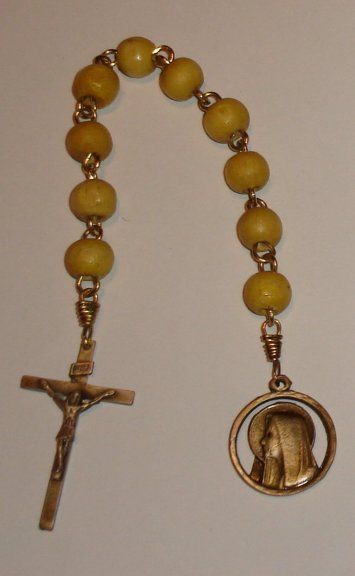 Denario abierto con motivo de la virgen niña elaborado en pelotitas de madera color crema detalles en metal medidas: 20cm de largo
