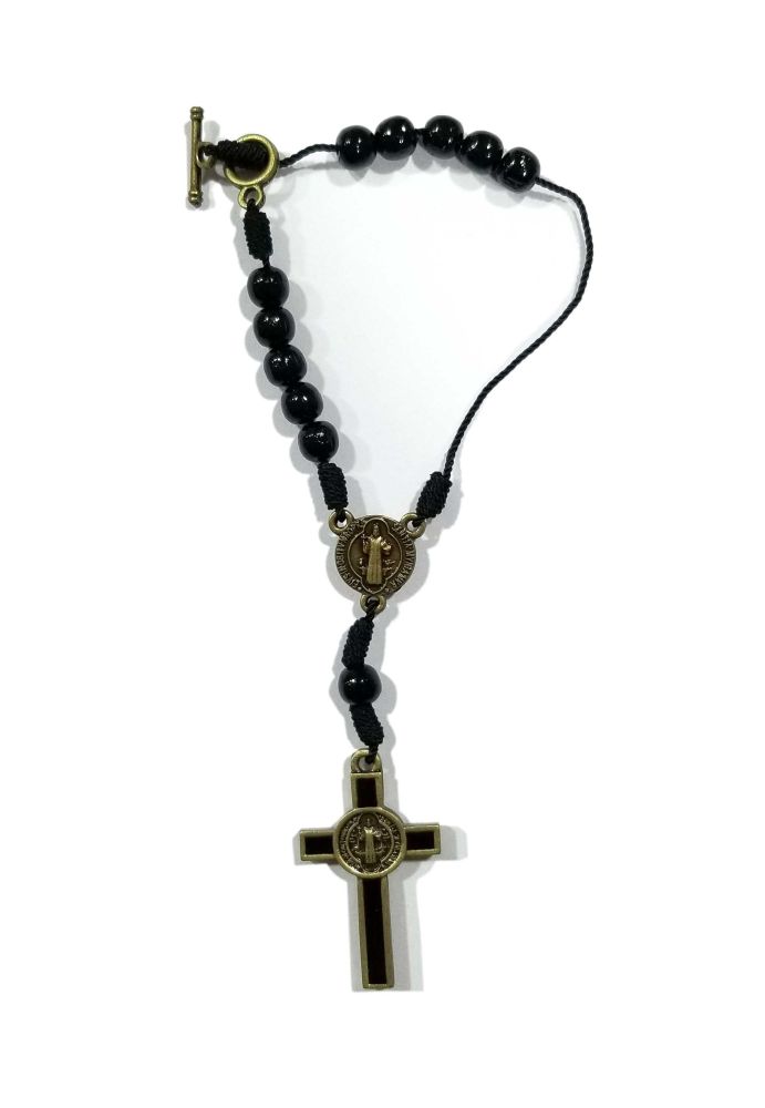 Denario importado con motivo de San benito color negro, especial para ajustar y llevar en auto, bici, moto, mochila, bolso. Color: negro con detalles de bronce Materiales: cuentas de madera y metal Tamano: 17cm de largo