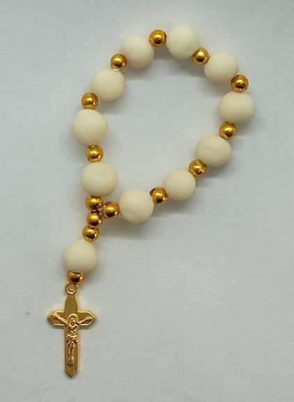 Denario cerrado con esferas blancas, doradas y cruz pequeña / Materialidad: Esferas blancas de cerámica en 6 mm. de diámetro – Esferas doradas de fantasía en 2 mm. de diámetro – Cruz dorada en fantasía de 2 x 1 cms.