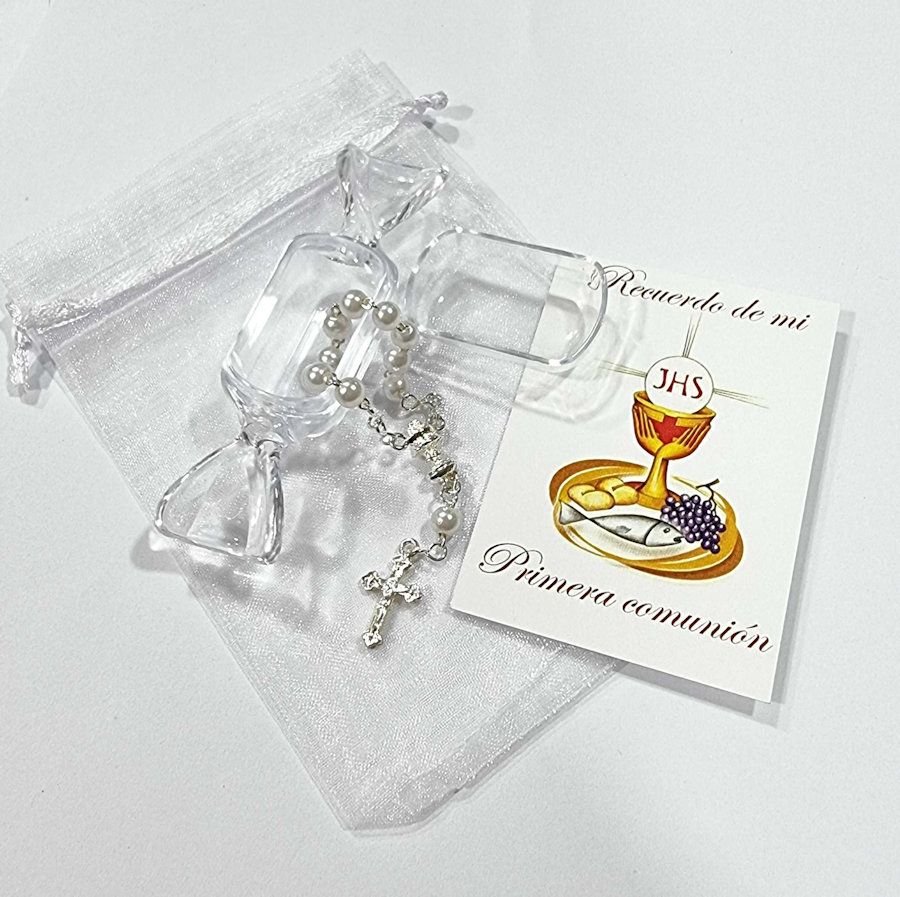 Denario de perlitas (sintéticas) blancas con motivo de primera comunión incluye tarjeta y saquito de gasa blanca junto a cajita en forma de dulce *la tarjeta NO se puede personalizar*