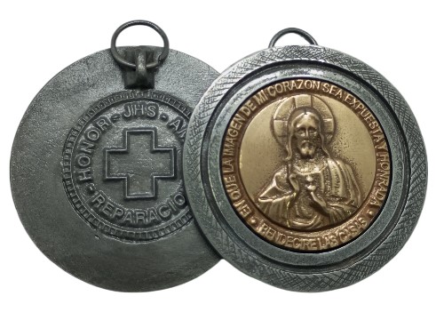 Detente bimetálico con borde color plata y centro en color bronce, con texto e imagen del sagrado corazón / detente para colgar grabado por ambas caras / Diámetro 6,5 cms. / venta por unidad
