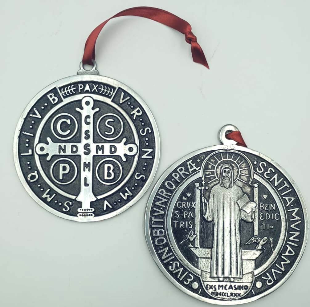 Detente metálico para colgar doble cara, color plata con fondo negro / cara 1: imagen de la cruz de San Benito – cara 2: imagen de San Benito de pie con báculo / Diámetro 9 cms. / valor es unitario
