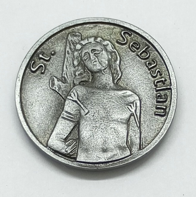 Detente metálico color plata con imagen de San Sebastián / con adhesivo doble faz por la parte trasera / dimensiones: diámetro 2,8 cms.