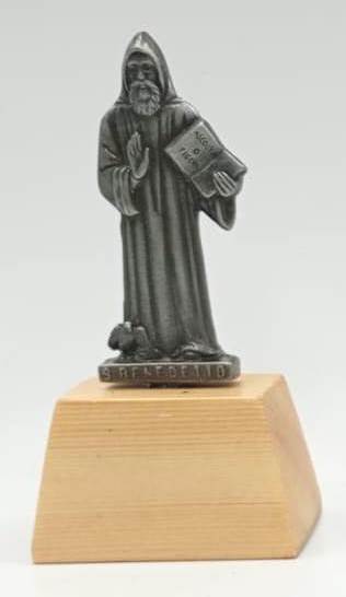 Estatuilla San Benito color plata / Elaborado en madera y metal / Dimensiones: Altura total 8 cms. – base madera 3,5 x 2,5 x 2 cms. – altura imagen 5,5 cms.