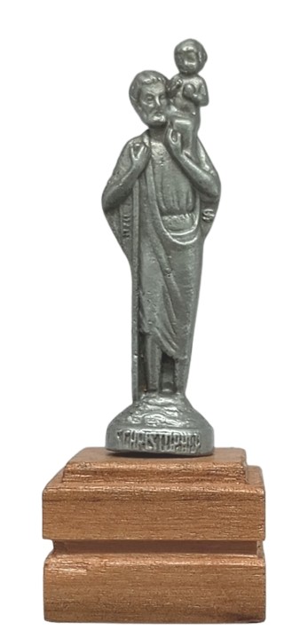 Imagen de San Cristóbal con niño, en metal color plata – dimensiones: 5,5 x 2,5 cms. / Base de madera natural, dimensiones: 2,8 x 2 x 2 cms. / Altura total estatuilla es de 7,5 cms.
