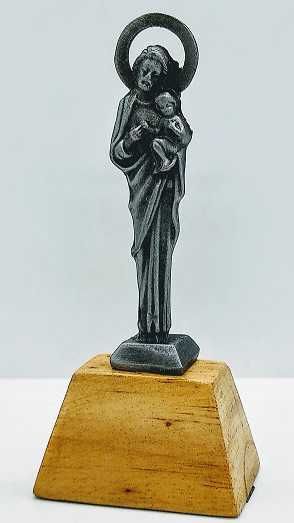 Estatuilla de metal con imagen de San jose y el nino Dios base de madera medida de 6cm base con figura total seleccione el color de la figura en la casilla siguiente: