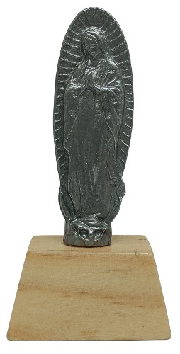 Imagen Virgen de Guadalupe, en metal color plata – dimensiones: 5,5 x 2 cms. / Base de madera natural – dimensiones: 3,5 x 2,5 x 2 cms. (altura total 7,5 cms.)