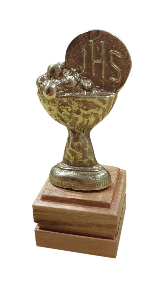 Icono con figura de copón, hostia y uvas elaborada en metal de aleación color bronceado base de madera tallada a mano medida: 7cm de alto total