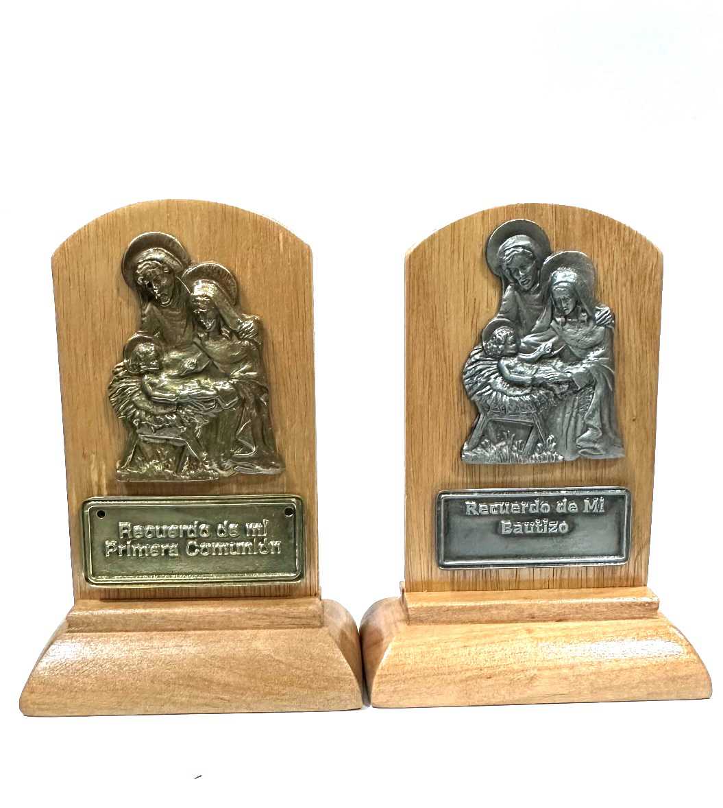 icono de madera con detalles en metal, personalizable por color y motivo de la plaquita.