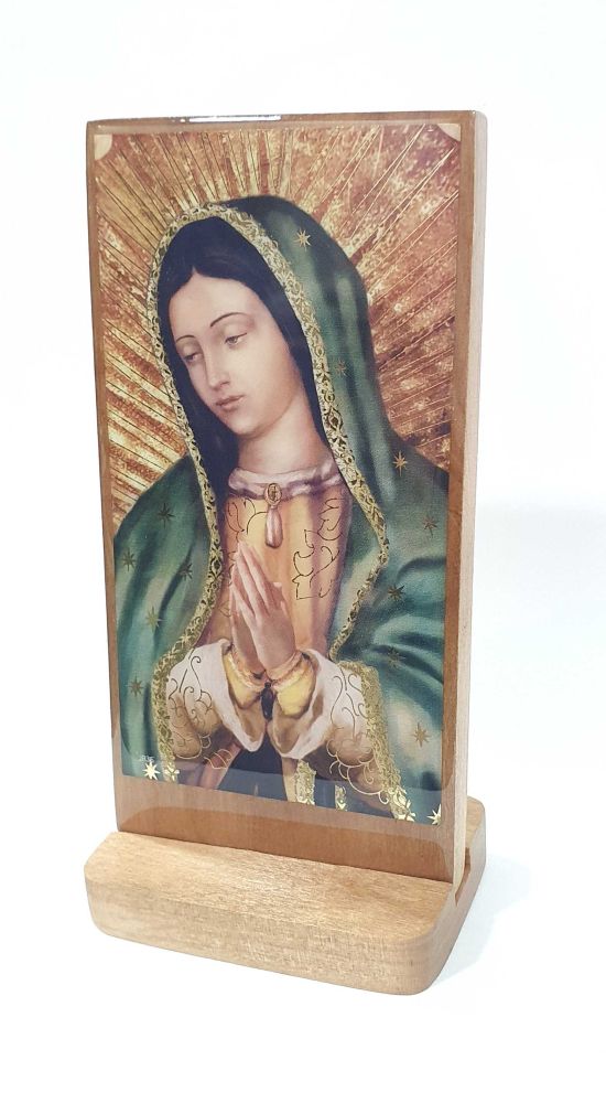 Icono en madera de la Virgen de Guadalupe imagen con rayos dorados con cubierta de resina efecto cristal medidas: 12×9 cm