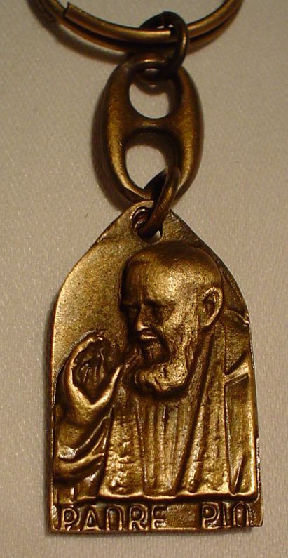 llavero metalico del Padre Pio color bronce medida: 10cm de largo aprox