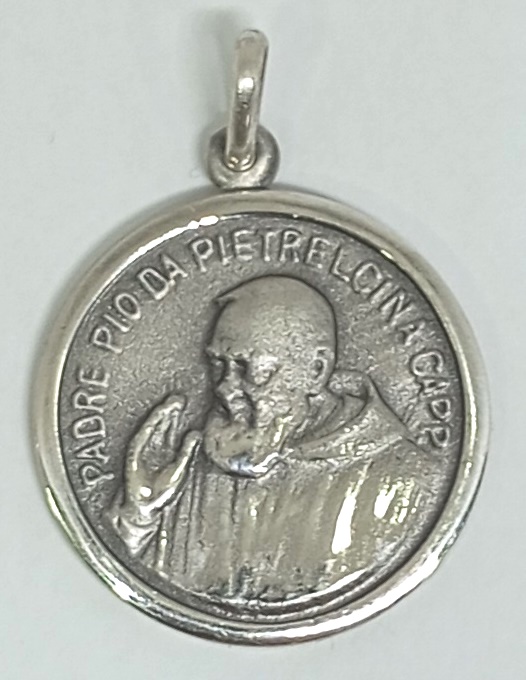 Medalla de plata padre Pío de Pietrelcina con texto y borde (filete) / diámetro : 24 mms.