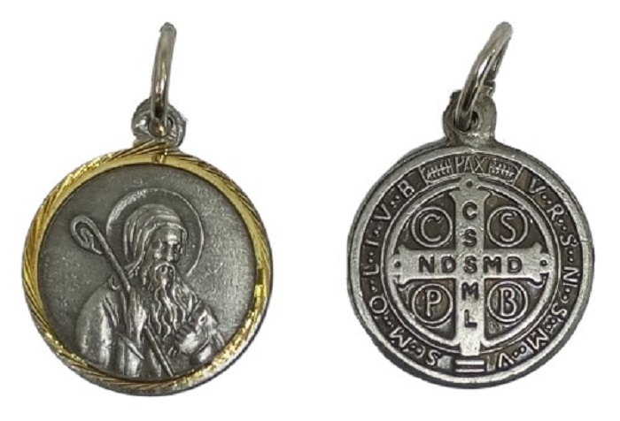Medalla doble cara con imagen y cruz de San Benito, mas borde dorado por una cara / materialidad Alpaca pulida / Diámetro 1,9 cms. / valor es por unidad.