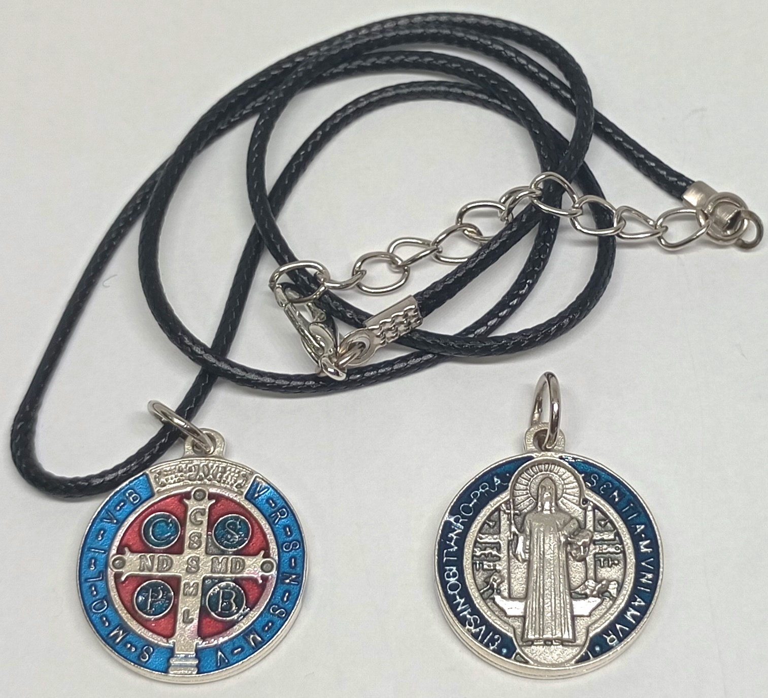 Medalla metálica de San Benito doble clara, esmaltada en colores / Diámetro 2 cms. / incluye colgante eco cuero / valor es por unidad